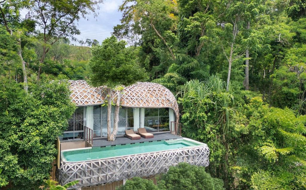 独立型ヴィラは部族の住居をモチーフにしています。「テント・プール・ヴィラ」は熱帯雨林の遊牧民から着想を得ており、ドーム型の屋根と高所に設置された楕円形のバスタブが特徴です。「ツリー・プール・ハウス」は「ウェハ」の天空一族を反映し、2階建ての構造と宙に浮いたような家具が特徴です。「クレイ・プール・コテージ」は伝統的なタイの茅葺き小屋を彷彿とさせます。 バード・ネスト・ヴィラは、海と森を見渡す、木とガラスで編まれた鳥かごを彷彿とさせます。
