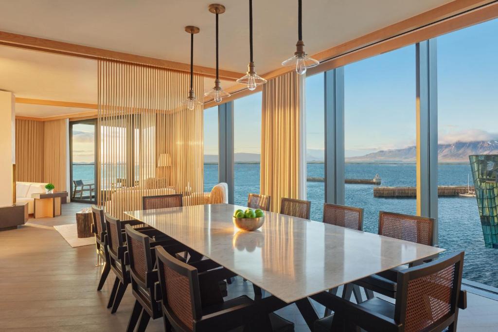 ロマン・アンド・ウィリアムズが設計を手がけたこのホテルは、明るい色の木材や地元の職人技といった北欧の要素を取り入れ、ミッドセンチュリー・モダンスタイルを再解釈しています。館内は、アイスランドの要素をさりげなく取り入れつつも、都会的な雰囲気を醸し出しており、ミシュランの星を獲得したレストラン「タイズ」では、地元の料理が味わえます。2つのエレガントなバーは、宿泊客と地元の人々が交流できる活気あふれるスポットとなっています。