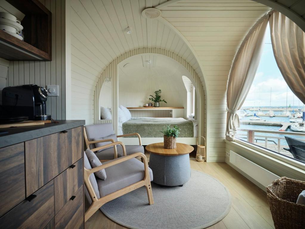 キャビンはコンパクトでありながら居心地が良く、タリン湾を一望できる大きな窓と、静かな朝や夕暮れ時のドリンクに最適なプライベートテラスを備えています。わずか9室という規模のイグルパークは、リラックスと創造性を刺激するように設計された、親密な滞在体験を提供します。